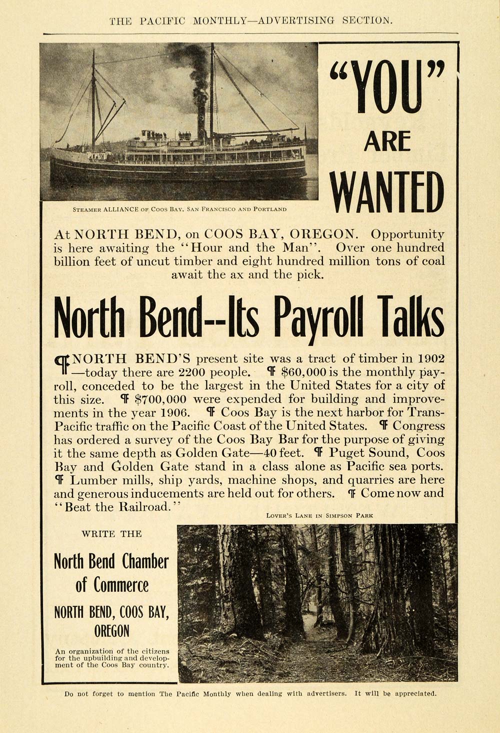 This is an original 1907 black and white print ad for the North Bend Chamber of Commerce, encouraging travel, tourism and residency in the area. This particular ad features an image of Lover's Lane in Simpson Park, as well as the Steamer "Alliance" of Coos Bay, San Francisco and Portland.