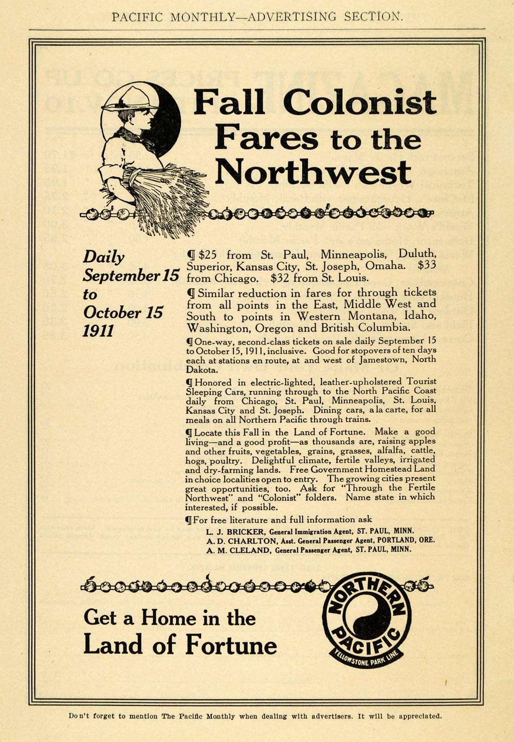 1911 Ad Northern Pacific Railway Colonist Fares Bricker - ORIGINAL PM2