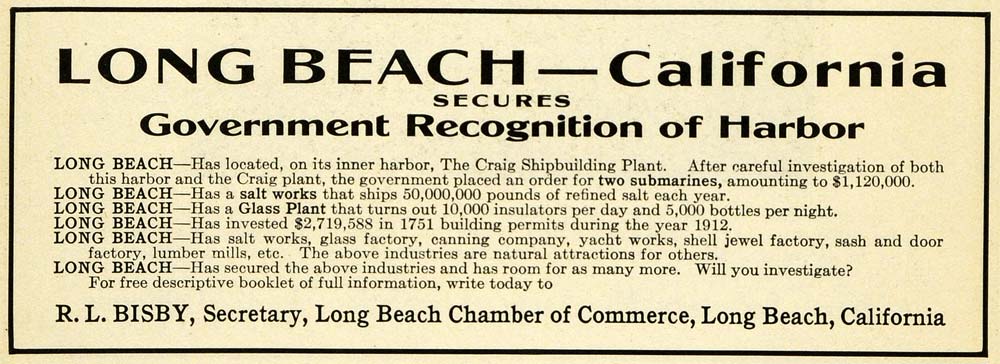1913 Ad Long Beach California Chamber Commerce R L Bisby Craig Shipbuilding PM3