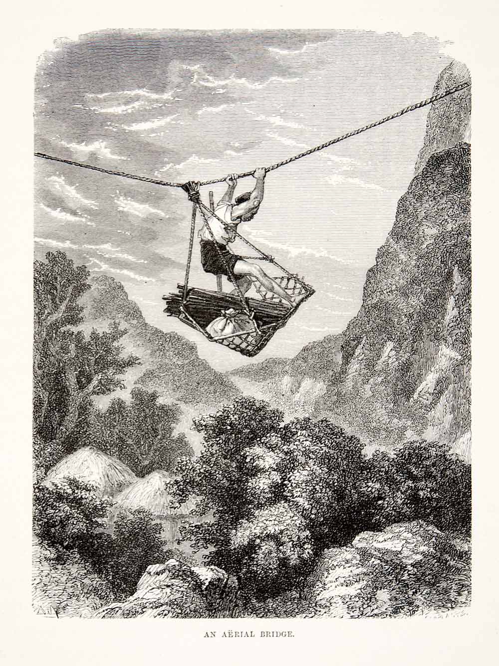1874 Wood Engraving Japan Japanese Aerial Bridge Transportation Rope XGHC8