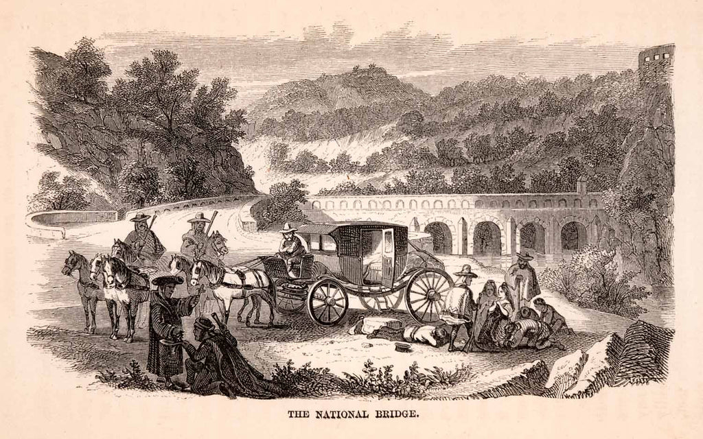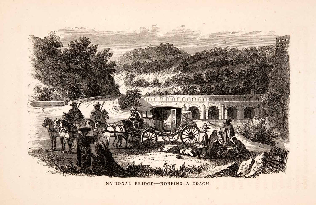 1855 Wood Engraving National Bridge Mexico Stagecoach Travelers Robbed XGMA5