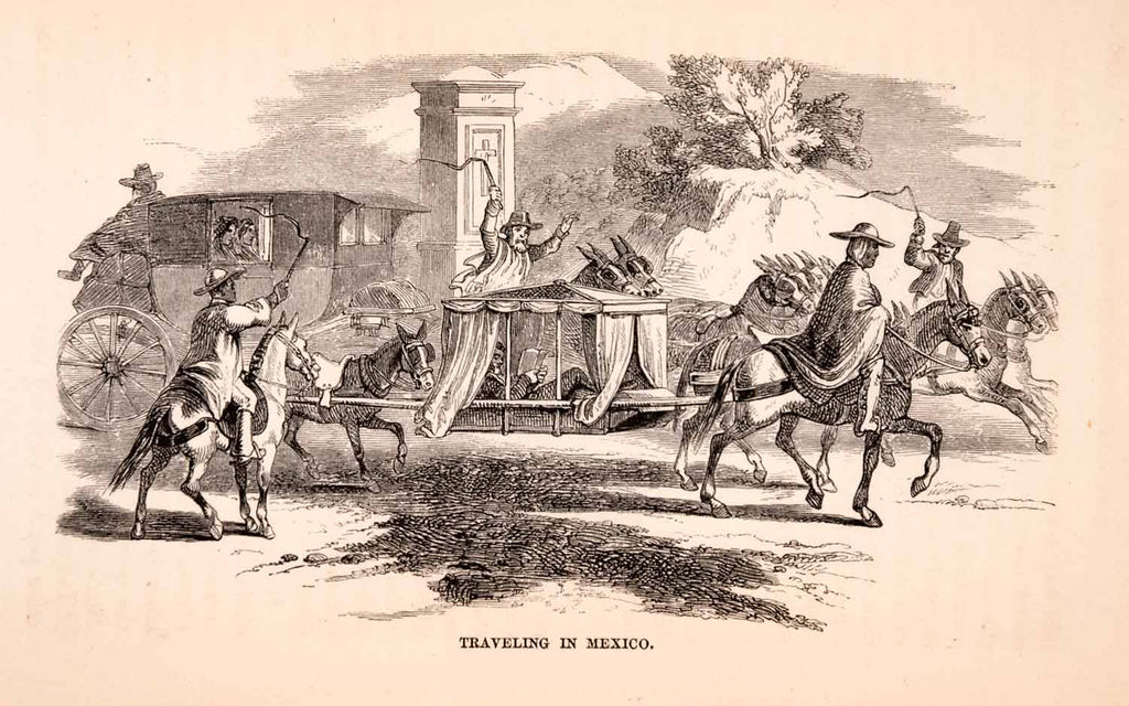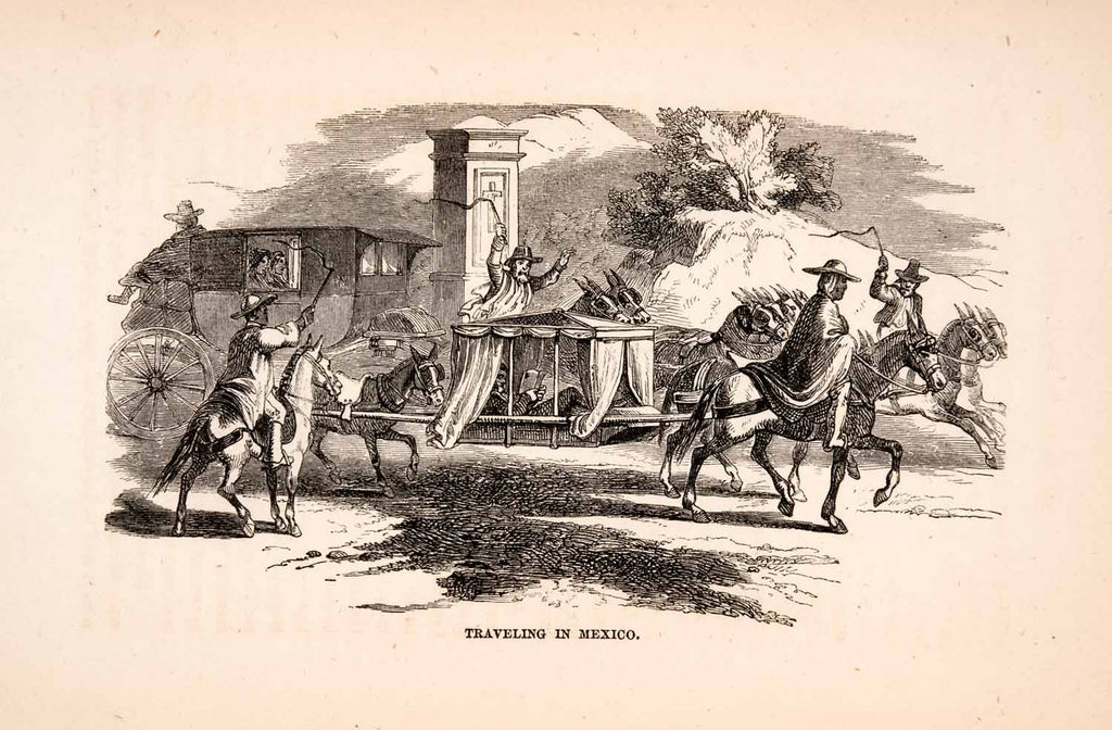 1855 Wood Engraving Mexico Litter Vehicle Stagecoach Travel Transportation XGMA5