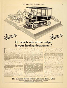 This is an original 1911 black and white print ad for Gramm Motor Truck Company located in Lima, Ohio. Interestingly, the ad lists, "The Gramm plant is the largest individual truck factory in the world".