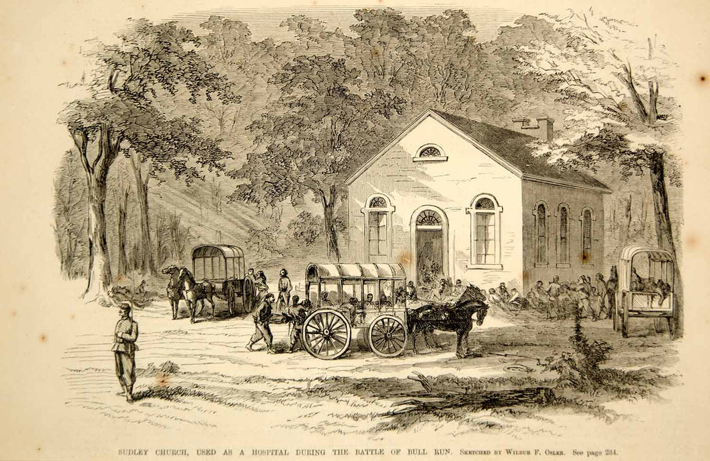 1861 Wood Engraving Sudley Church Hospital Manassas Bull Run U.S. Civil War NYN1
