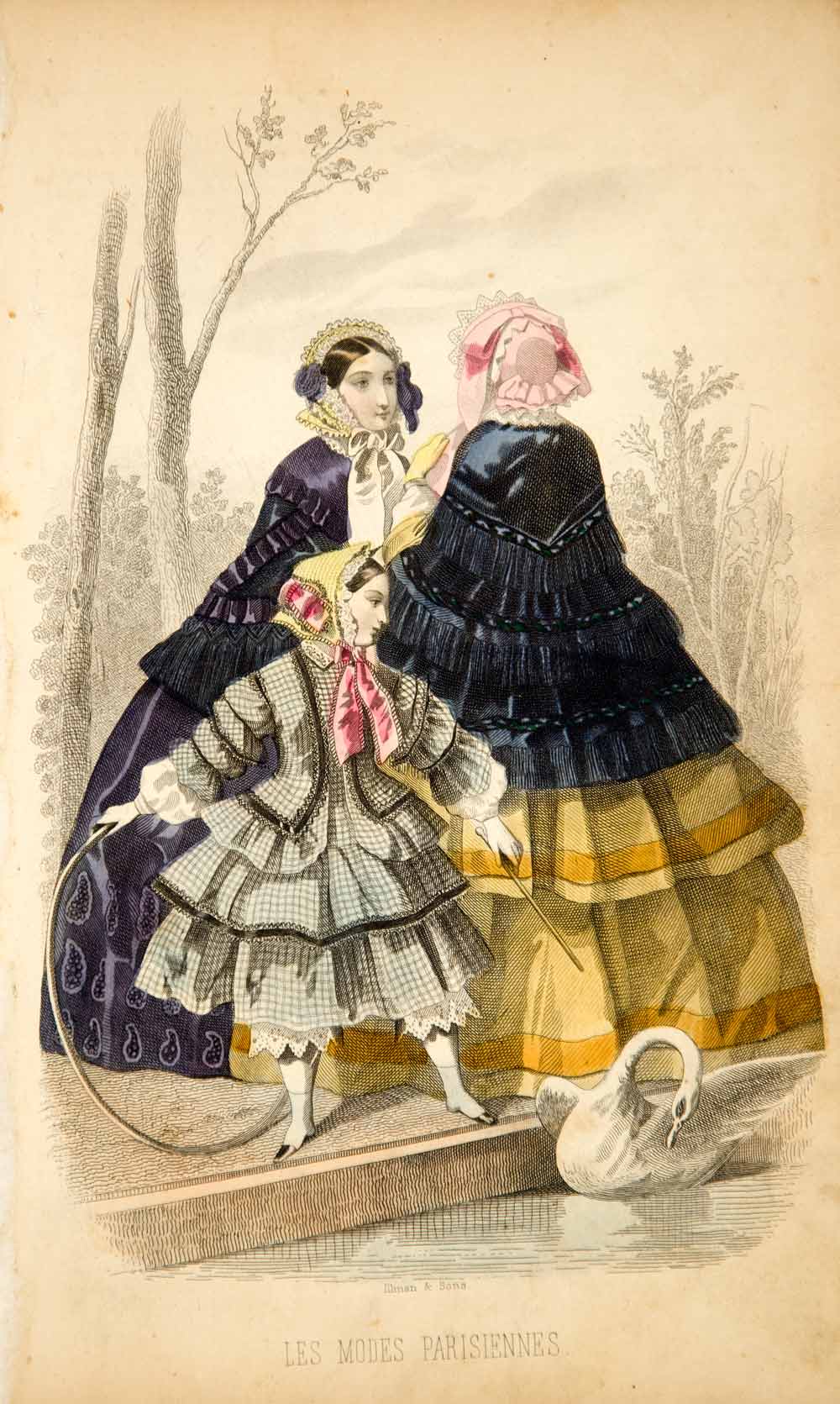1856 Steel Engraving Victorian Antebellum Fashion Lady Carriage Dress Girl YPM2