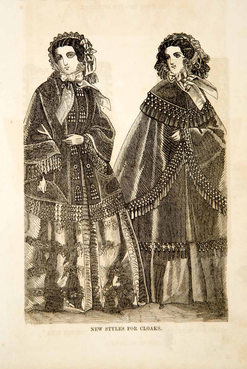 1856 Wood Engraving Antique Victorian Fashion Lady Cloaks Bonnets Outerwear YPM2