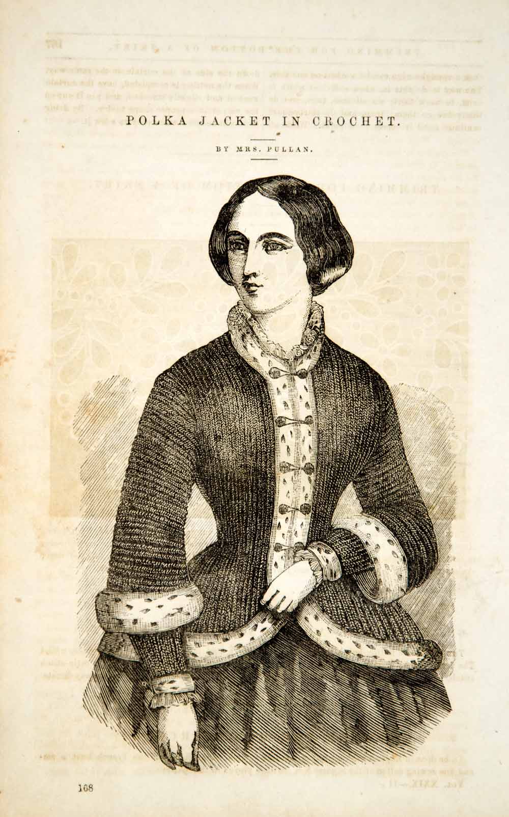 1856 Wood Engraving Antique Victorian Lady Polka Jacket Crochet Fashion YPM2