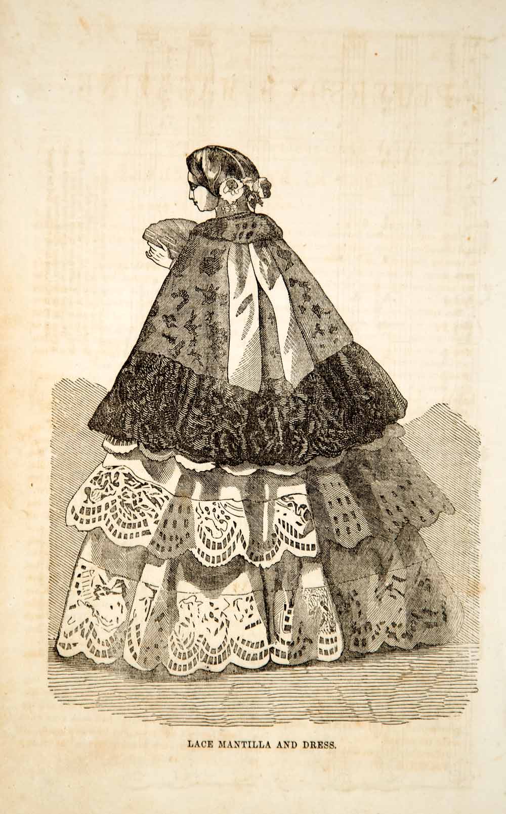1856 Wood Engraving Antique Victorian Lady Lace Mantilla Dress Fashion Cape YPM2