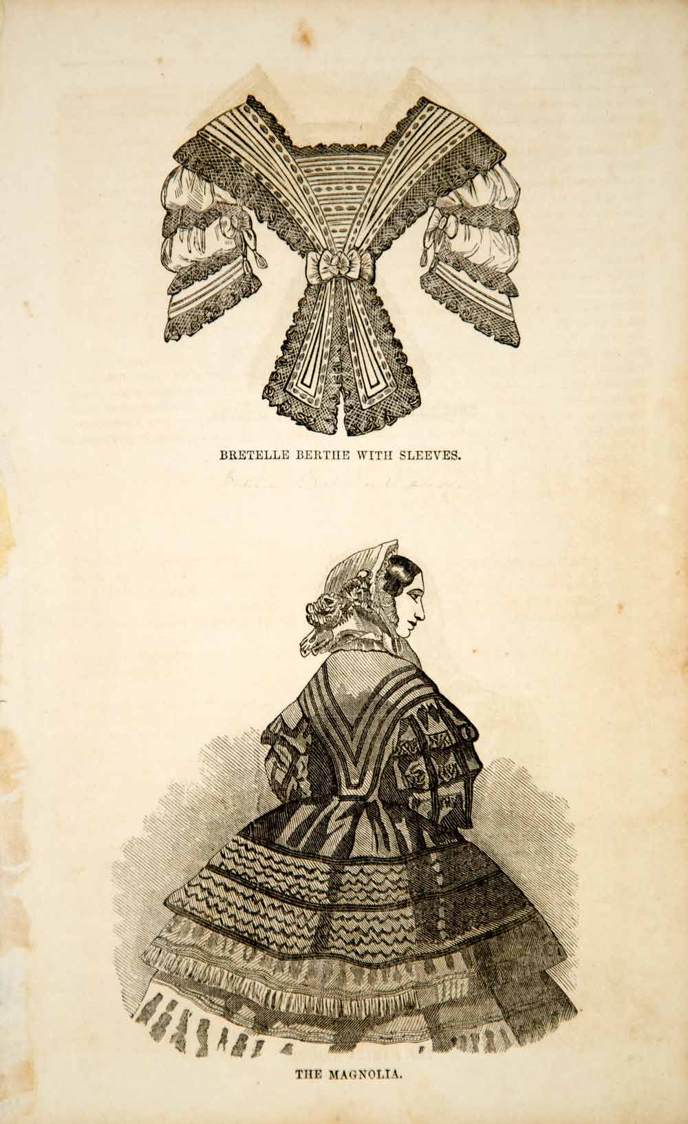 1856 Wood Engraving Antique Victorian Fashion Bretelle Berthe Cloak Lady YPM2