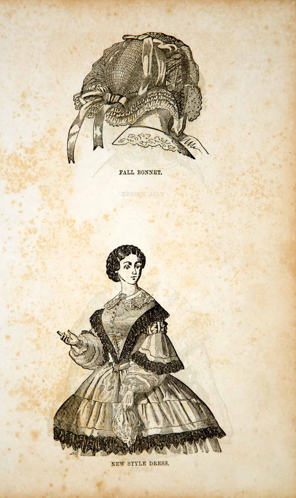 1856 Wood Engraving Antique Victorian Fashion Bonnet Dress Costume Lady YPM2