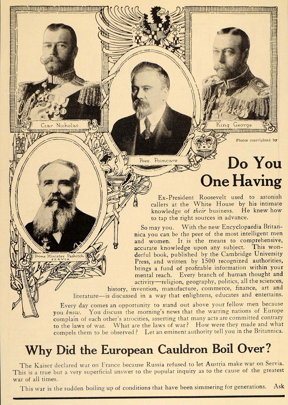 1914 Ad Encyclopedia Britannica WWI Pashitch George V Czar Nicholas OLD6