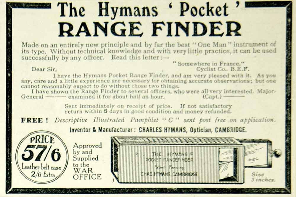 1915 Ad World War I Charles Hymans Pocket Range Finder Optical Instrument Advert