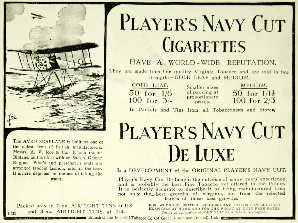 1915 Ad Player's Navy Cut Cigarettes Tobacco World War I Avro Seaplane Biplane