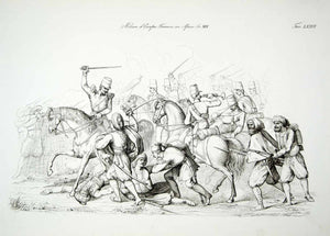 This is an original 1843 black and white copper engraving of an illustration by Giacomo Casa of a battle between French cavalry soldiers and Algerian infantry in the armies the Ottoman Empire in Africa during the French Conquest of Algeria that took place between 1830-1847.