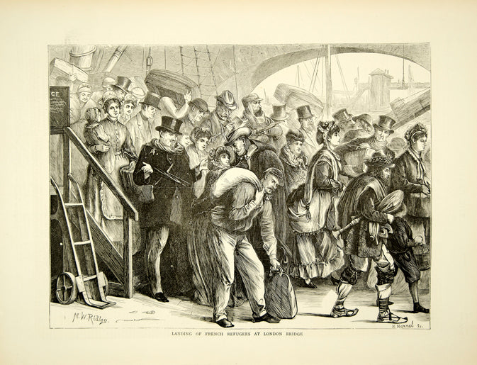 1870 Wood Engraving MW Ridley Art Landing French Refugees London Bridge YTG1