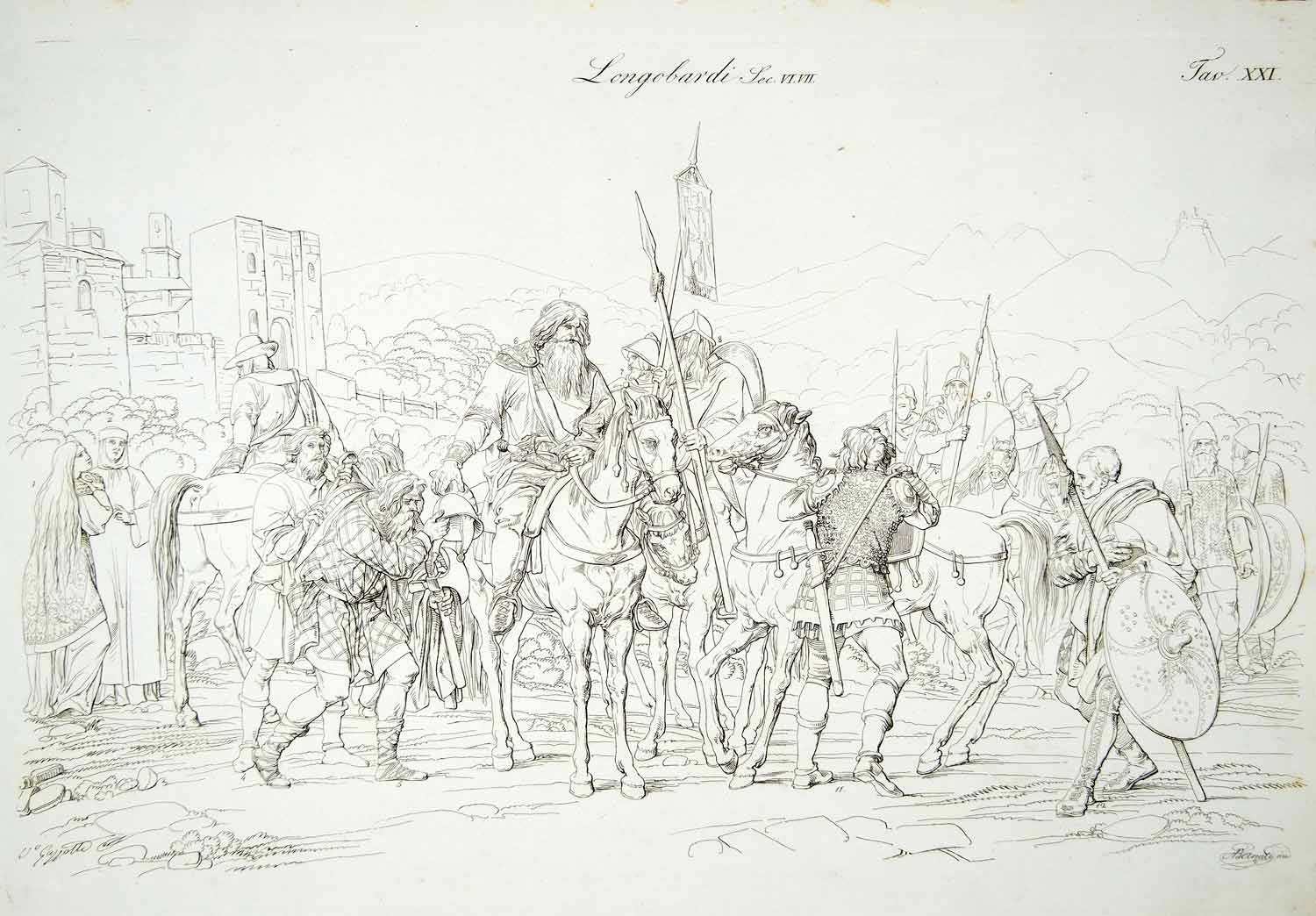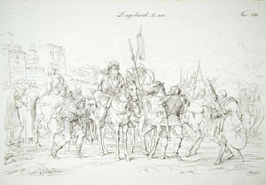 This is an original 1834 black and white copper engraving of the typical dress or costume of the Lombards or Langobards, a Germanic tribe who ruled Italy from 568 to 774.
