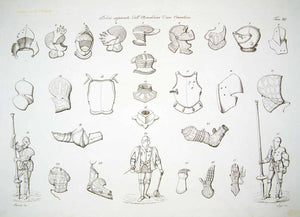 This is an original 1843 black and white copper engraving of an illustration by Antonio Bernati of pieces of armor from the Middle Ages, including; close helmets, armets, cuirasses, cowters, pauldrons, gauntlets, gorgets, and others.
