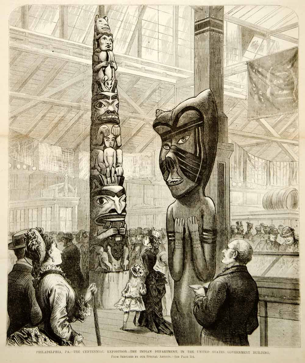 1876 Engraving Centennial Exposition Philadelphia Native American Totem Pole