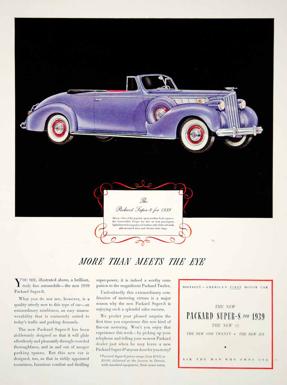 This is an original 1939 color print ad for the Packard Super-8 Convertible Coupe for two or four passengers.