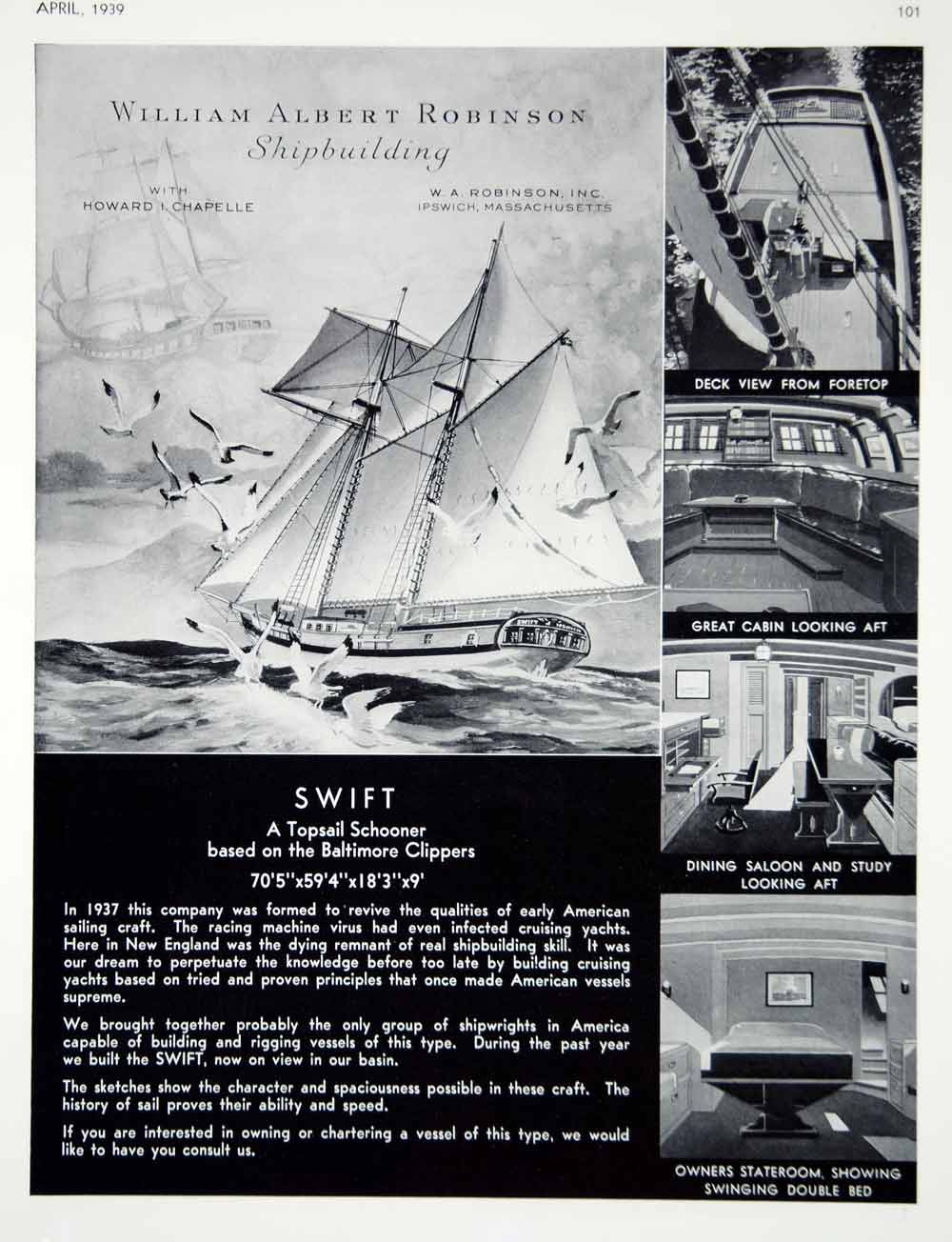 This is an original 1939 black and white print ad for William Albert Robinson, Shipbuilding, Ipswich, Massachusetts. The ad includes sketches of the interior and exterior of their new ship, the Swift, a topsail schooner.