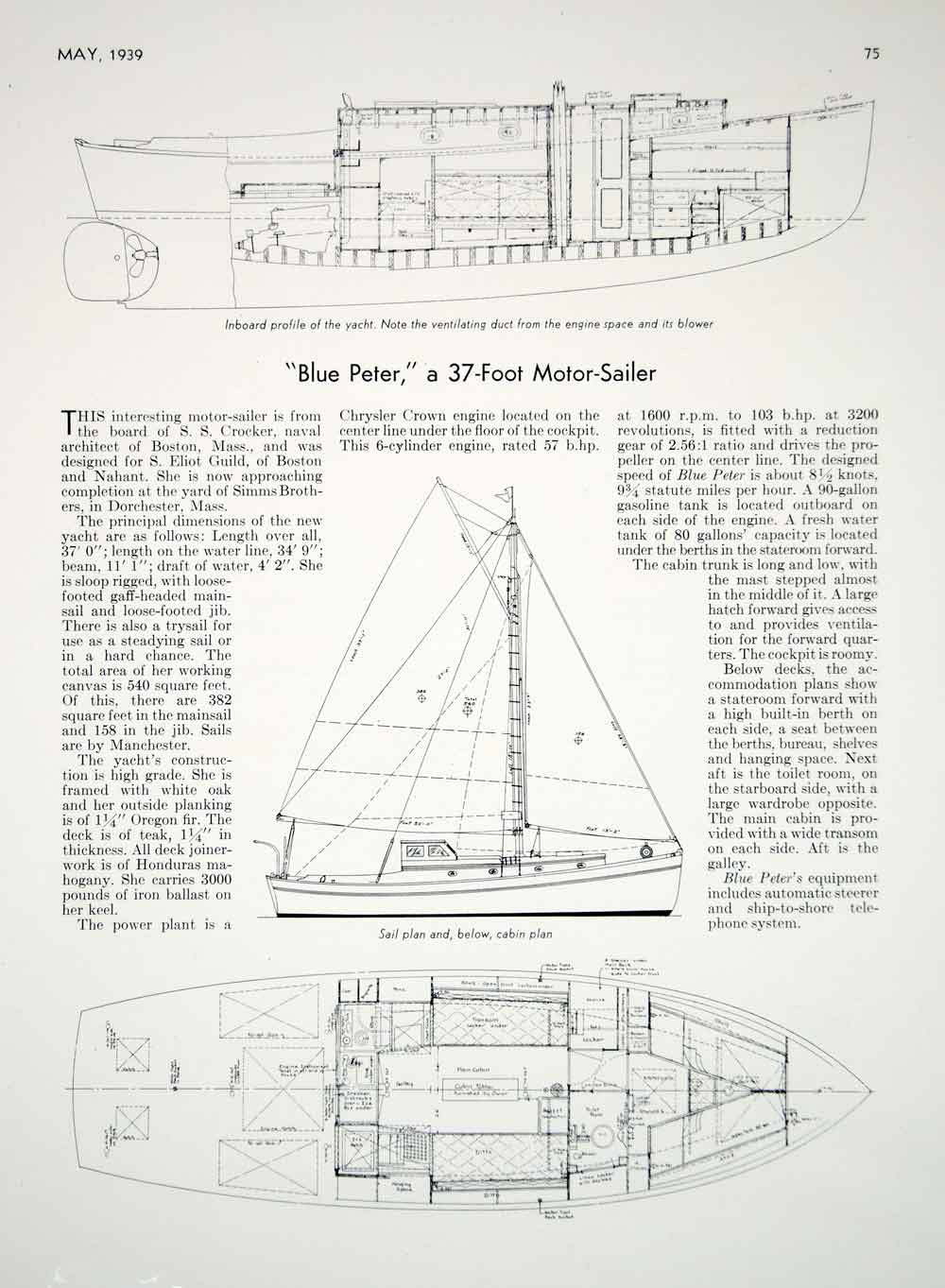 This is an original 1939 one-page black and white print article describing the "Blue Peter," a new 37-foot motor-sailer yacht designed by naval architect Samuel Sturgis Crocker of Boston, and built at the yard of Simms Brothers in Dorchester, MA for S. Eliot Guild of Boston and Nahant. The article includes a profile diagram, sail plan, and cabin plans.