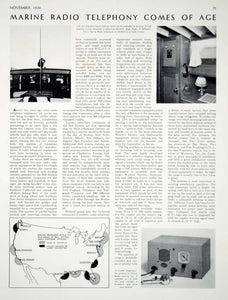 This is an original 1939 one-page black and white print article "Marine Radio Telephony Comes of Age" describing the increased use of two-way radio telephones for yachts.