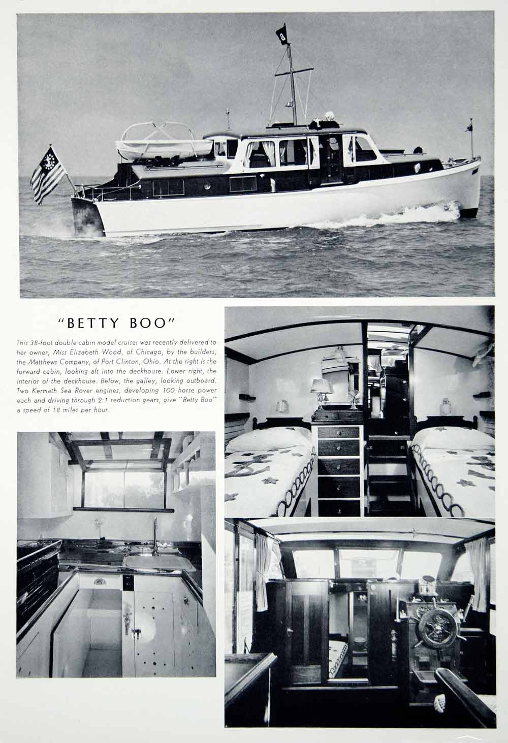 This is an original 1939 black and white halftone print of the Betty Boo, a 38-foot double cabin cruiser built by the Matthews Company for Miss Elizabeth Woods of Chicago. The print includes halftone images of the yacht's interior including the cockpit, galley, and forward cabin.