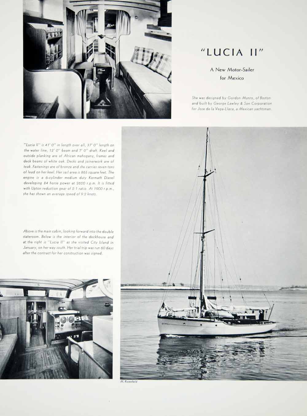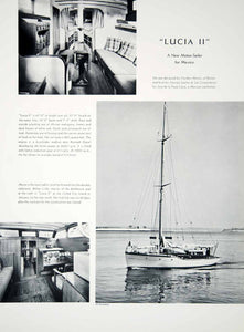 This is an original 1939 black and white halftone print of the Lucia II, a 41-foot motor sailor designed by Gordon Munro of Boston and built by George Lawley & Son for Jose de la Vega-Llaca, a Mexican yachtsman. The print includes halftone images of the yacht's interior including the deckhouse, and the main cabin.