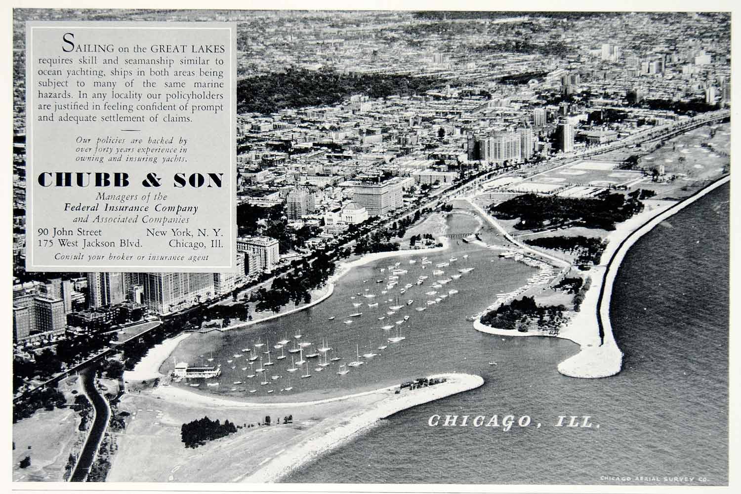 This is an original 1940 black and white print ad for marine insurance from Chubb & Son, 90 John Street, NYC. The ad has an aerial view of a marina at Chicago.