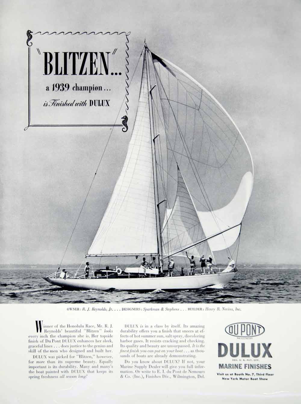 This is an original 1940 black and white print ad for DuPont Dulux Marine Finishes with a halftone image of the winner of the 1939 Honolulu Race, the