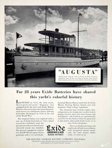 This is an original 1940 black and white print ad for Exide Ironclad Marine Batteries from The Electric Storage Battery Company, Philadelphia, with a halftone image of the 103 foot diesel-powered yacht