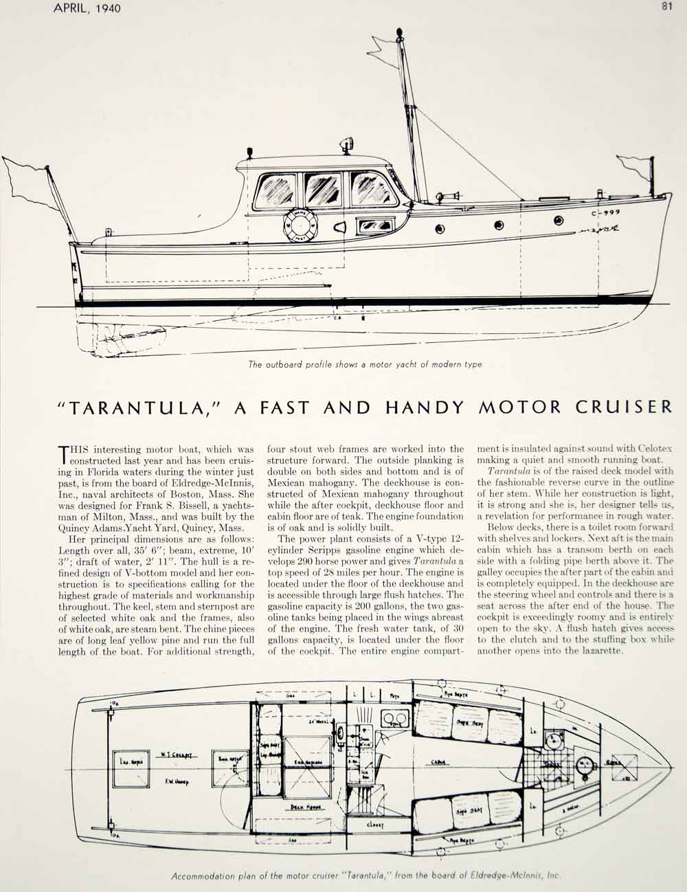 This is an original 1940 one-page black and white print article describing the "Tarantula," a new 35-foot, 6-inch motor cruiser, designed by Eldredge-McInnis, Inc. of Boston and built by the Quincy Adams Yacht Yard, Quincy, MA for Frank S. Bissell of Milton, MA. The article includes a profile diagram and cabin plan.