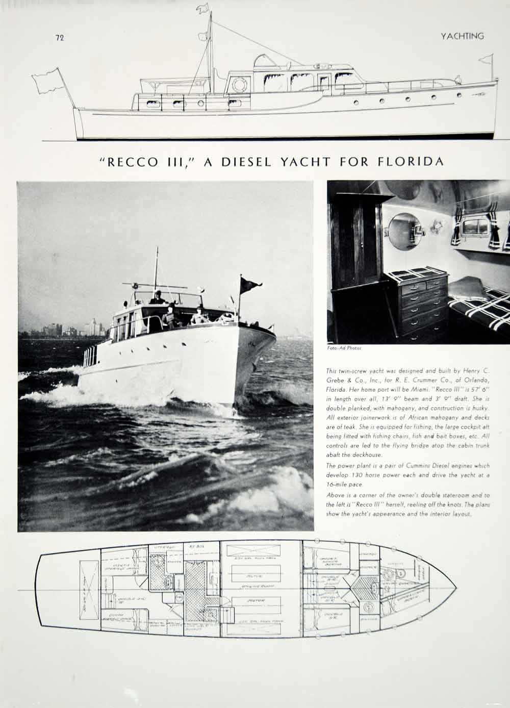 This is an original 1940 black and white halftone print of the Recco III, a 57-foot, 6 inch twin-screw diesel yacht designed and built by the Henry C. Grebe & Co. for R. E. Crummer Co. of Orlando, Florida. The print includes halftone images of the yacht's interior including the double stateroom and the cabin plan.