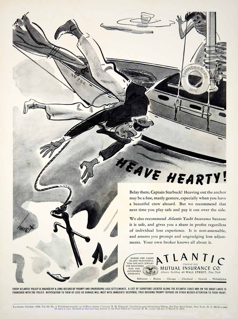 1939 Ad Vintage Atlantic Mutual Insurance Yacht Policy Earl Oliver Hurst Cartoon