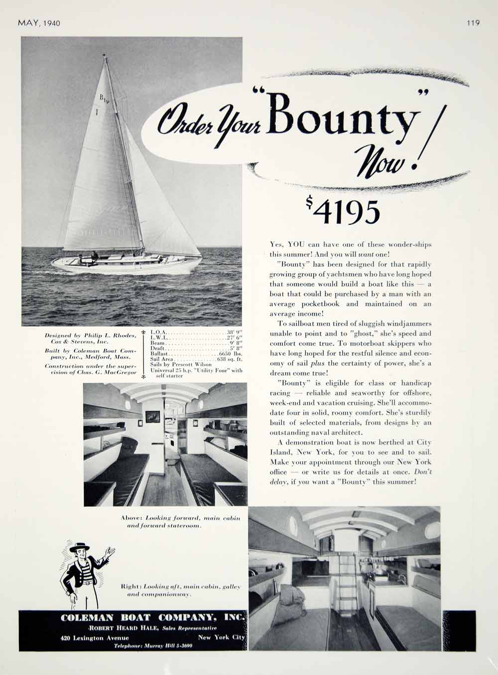 1940 Ad Vintage Coleman Boat Bounty Sailboat Main Cabin Stateroom Galley Yacht