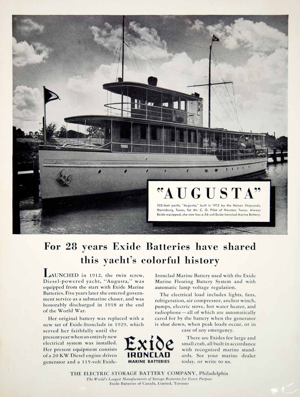 1940 Ad Vintage Exide Marine Batteries Augusta Yacht C. G. Pillot Houston Boat