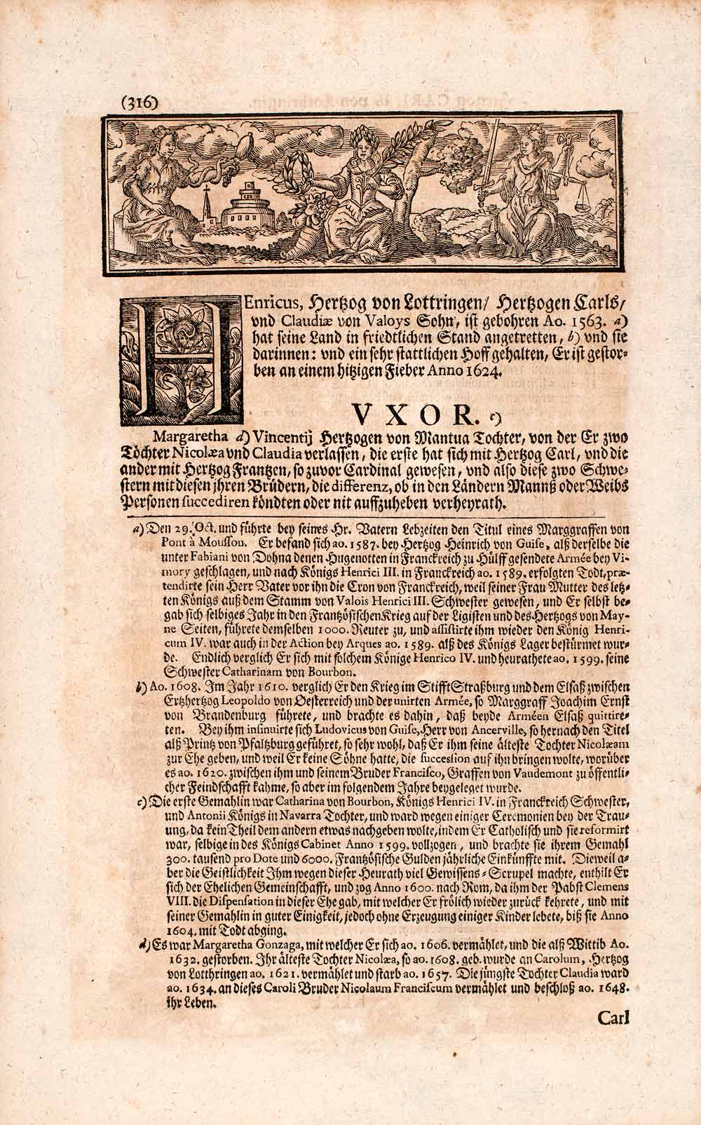 This is an original 1721 black and white copper engraving of "Nainrich Hertzog von Lottringen." This is a portrait of Henry II, Duke of Lorraine from 1608 to 1624. He was the son of Charles III, Duke of Lorraine and Claude of Valois. The portrait is surrounded by a wonderful decorative motif featuring a military helmet flanked by ruffled flags at the top of the print and a filigreed botanical design at the bottom of the print. This piece is accompanied by the original German biographical text printed on a separate sheet and features a decorative drop cap and an exquisite vignette comprised of three figures seated in a landscape.