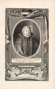 This is an original 1721 black and white copper engraving of "Wolfgangus Cämerer von Talleburg Churfürst von Maintz." This is a portrait of Wolfgang von Dalberg, Archbishop-Elector of Mainz from 1582 to 1601. He was the son of Friedrich Kämmerer von Worms (Dalberg) and Anna von Fleckenstein. The Archbishops of Mainz were Arch Chancellors of the Holy Roman Empire and the most important of the seven Electors of the German Emperor. Traditionally, the Archbishops of Mainz were primas germaniae, a title of honor for the most important Catholic Bishop in Germany; they were the substitutes for the Pope north of the Alps. The portrait is surrounded by a wonderful decorative motif featuring the Oldest Electoral Hat, signifying the subject as a Prince-Elector, or simply Elector, a member of the electoral college of the Holy Roman Empire. These individuals had the function of electing the Roman King or, from the middle of the sixteenth century onwards, directly electing the Holy Roman Emperor. The Oldest Electoral Hat gently rests upon velvet cloth at the top of the print, with the cloth cascading down the sides of the portrait. At the base of the frame is a decorative motto incorporating a botanical design.