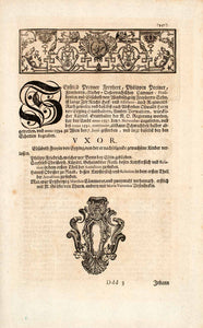 Period Paper is pleased to offer an extremely rare and impressive early eighteenth century collection of biographies and portrait engravings and etchings, produced in Leipzig, Germany in 1721 and 1722. Included are notable monarchs, rulers, religious figures, and members of notable Houses throughout Europe, including several genealogical charts of dynastic lines, spanning the sixteenth to early eighteenth centuries. The collection is comprised of exquisitely engraved and etched copper portrait plates framed by varying decorative motifs, all engraved by Johann Friedrich Rosbach. Many of the portraits include separate biographical pieces ranging in length from a single paragraph to several pages for more notable European monarchs and emperors. If present, the accompanying text is in German and is composed of beautiful woodcut text, with most pages containing elegantly etched drop cap initials, head-and tail-pieces and vignettes. The superb, folio-sized stock upon which the collection is engraved and etched employed the latest advances in eighteenth century paper making and highlights the era's predilection for strong, lightly sized paper with a fine structure and smooth surface. The paper's characteristics are thus similar to Japanese Gampi, and the result is well-preserved and crisp images that exceptionally capture Rosbach's fluid and sharp line work. This collection represents a unique opportunity to collect a valuable part of European history stunningly composed and illustrated.