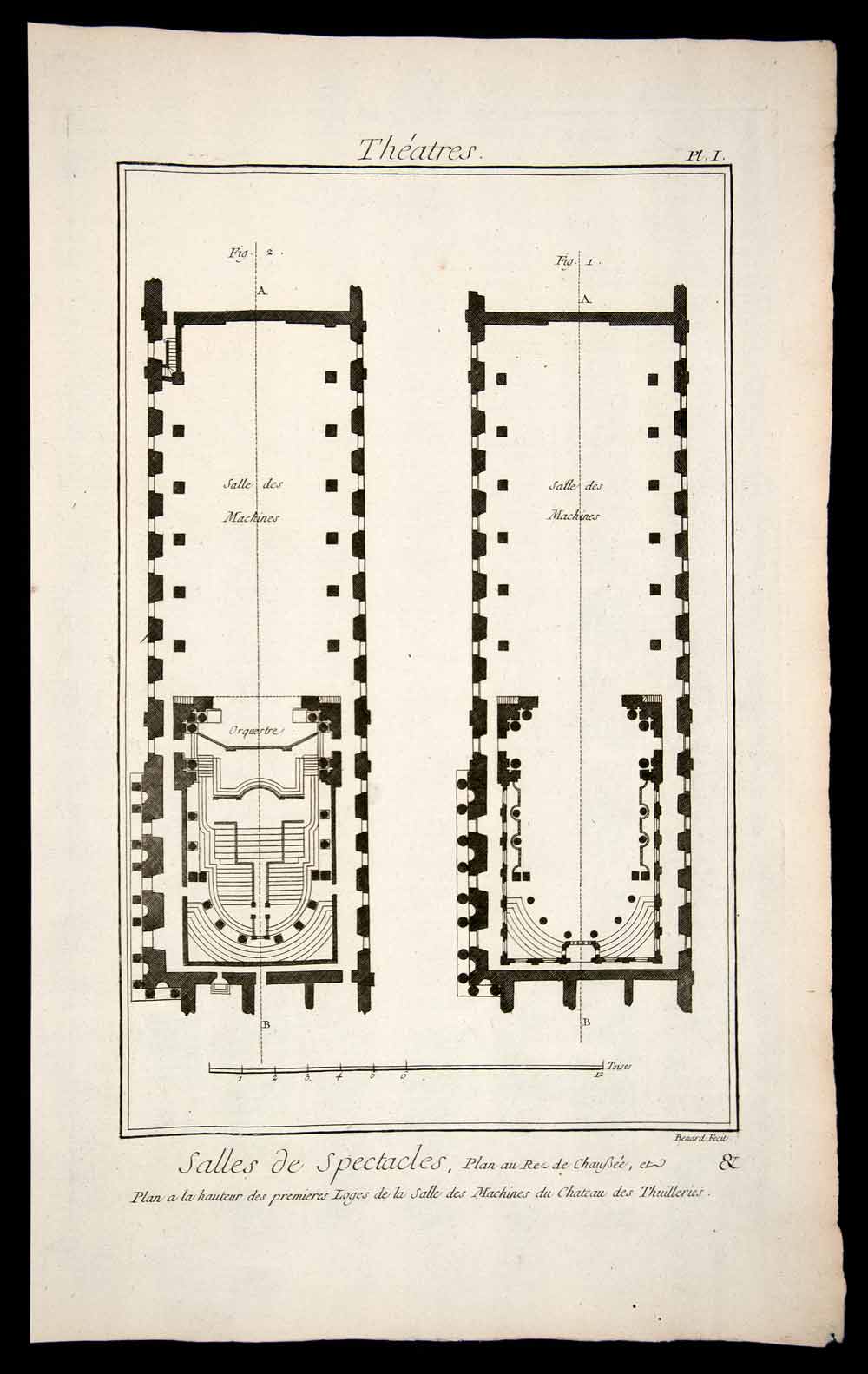 Period Paper is pleased to offer an exceptionally rare collection of original, first edition, to-scale architectural copper line engravings of European theatres represented in plan, section, elevation and mechanical detail. Compiled in 1770 by Denis Diderot and Jean le Rond dÕAlembert as a portion of their innovative encyclopedic series Encyclopédie, ou Dictionnaire Raisonné des Sciences, des Arts et des Métiers, or Encyclopaedia, or a Systematic Dictionary of the Sciences, Arts and Crafts, the collection represents a selection of some of the final images originally printed for the series, which ceased publication under the original authors in 1772.