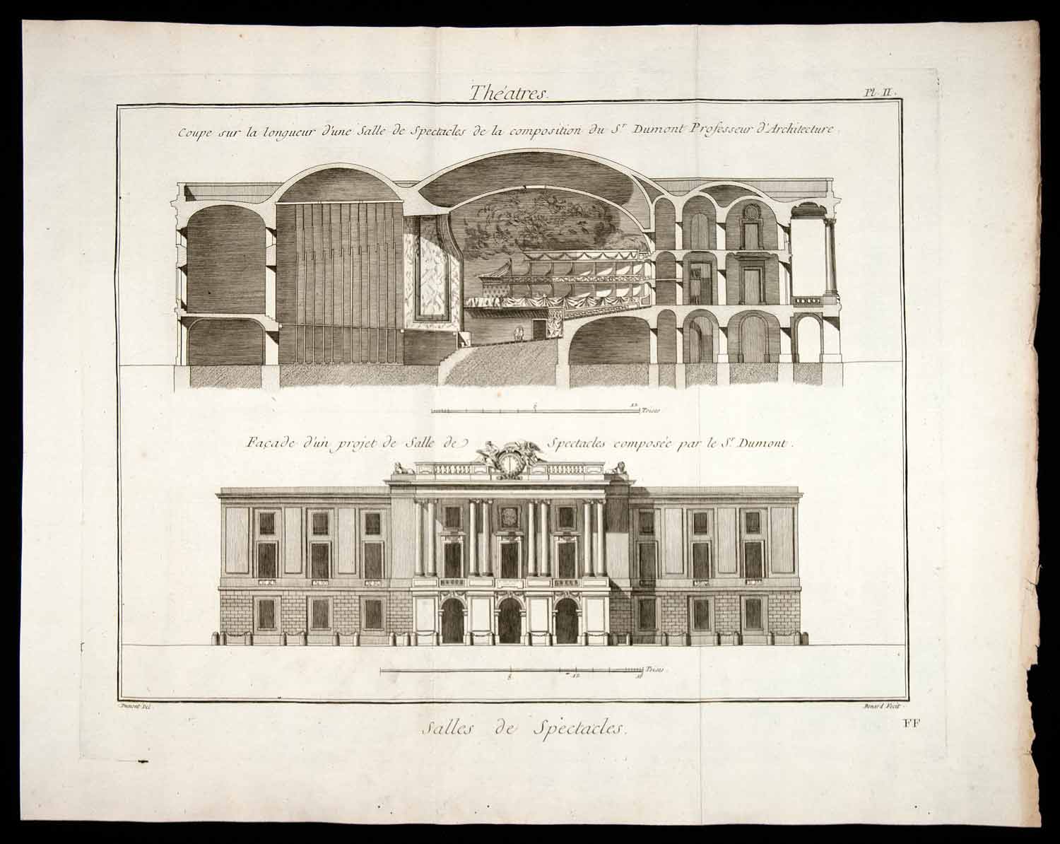 Period Paper is pleased to offer an exceptionally rare collection of original, first edition, to-scale architectural copper line engravings of European theatres represented in plan, section, elevation and mechanical detail. Compiled in 1770 by Denis Diderot and Jean le Rond dÕAlembert as a portion of their innovative encyclopedic series Encyclopédie, ou Dictionnaire Raisonné des Sciences, des Arts et des Métiers, or Encyclopaedia, or a Systematic Dictionary of the Sciences, Arts and Crafts, the collection represents a selection of some of the final images originally printed for the series, which ceased publication under the original authors in 1772.