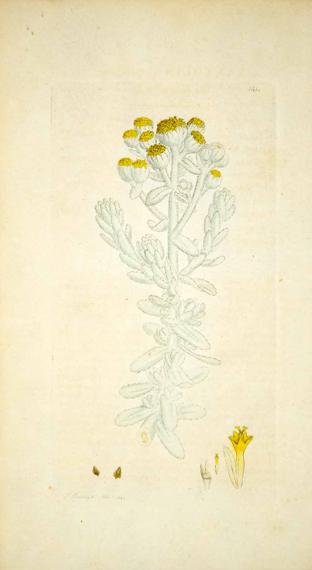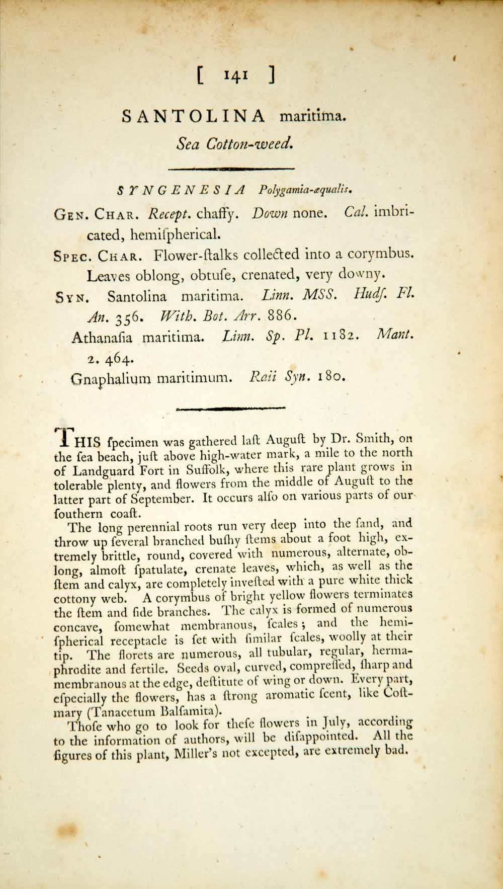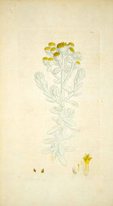 This is an original 1793 hand-colored copper engraving of the Santolina maritima, commonly known as sea cotton-weed, that is found in England. A page of descriptive text accompanies this plate. Please see both images.