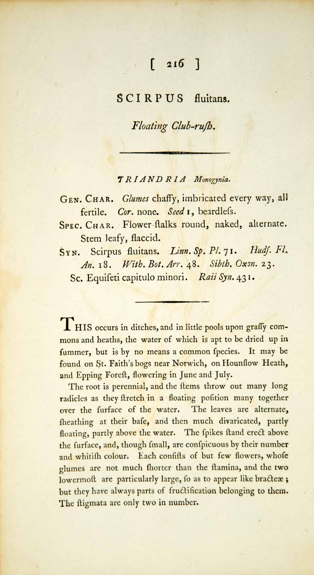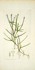 This is an original 1794 hand-colored copper engraving of the Isolepis fluitans, commonly known as floating club-rush, that is native to Africa, Australia, and Europe. A page of descriptive text accompanies this plate. Please see both images.