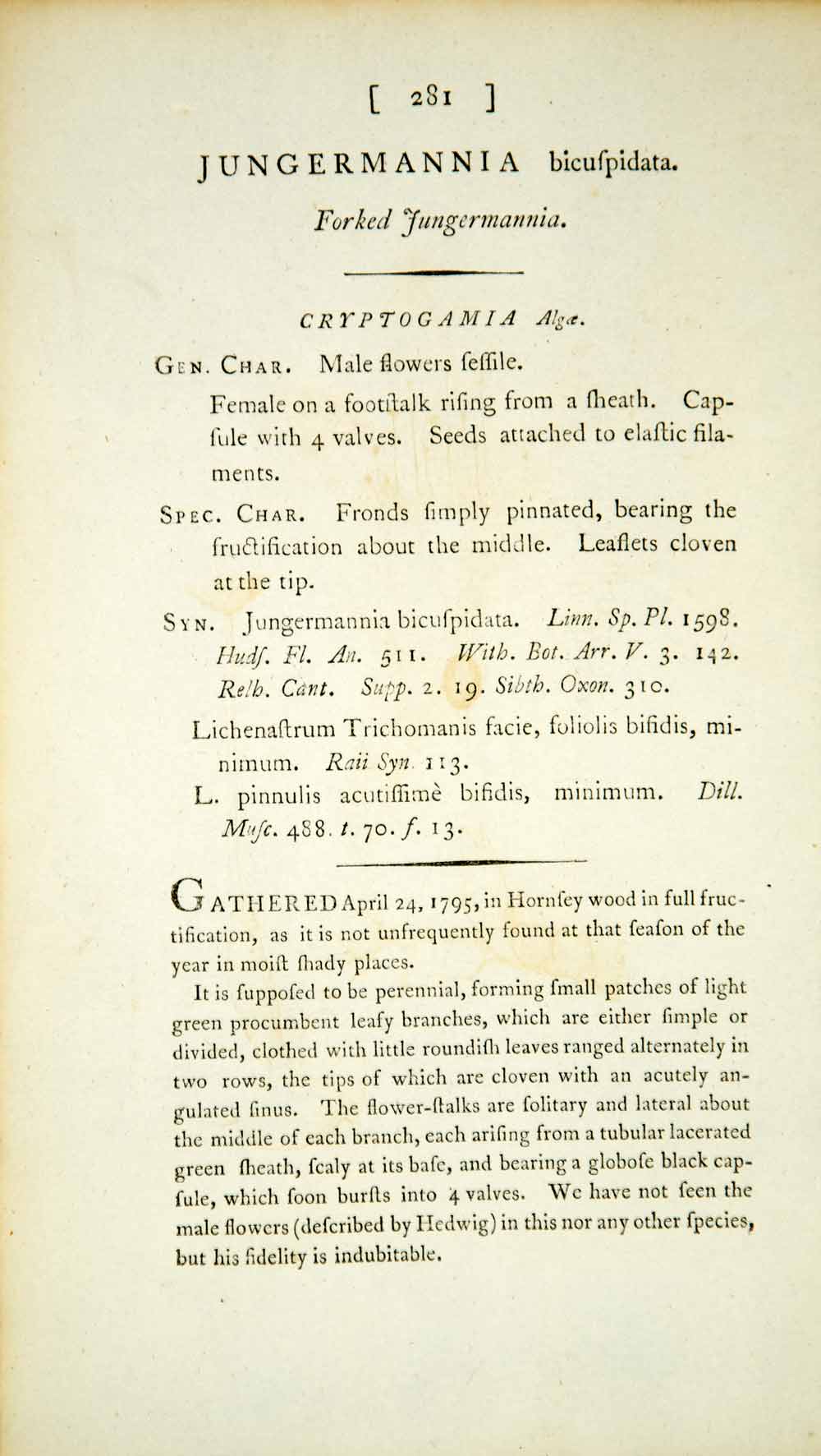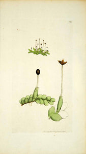 This is an original 1795 hand-colored copper engraving of the Cephalozia bicuspidata, commonly known as Two-horned Pincerwort moss, that is found in the Northern Hemisphere. A page of descriptive text accompanies this plate. Please see both images.