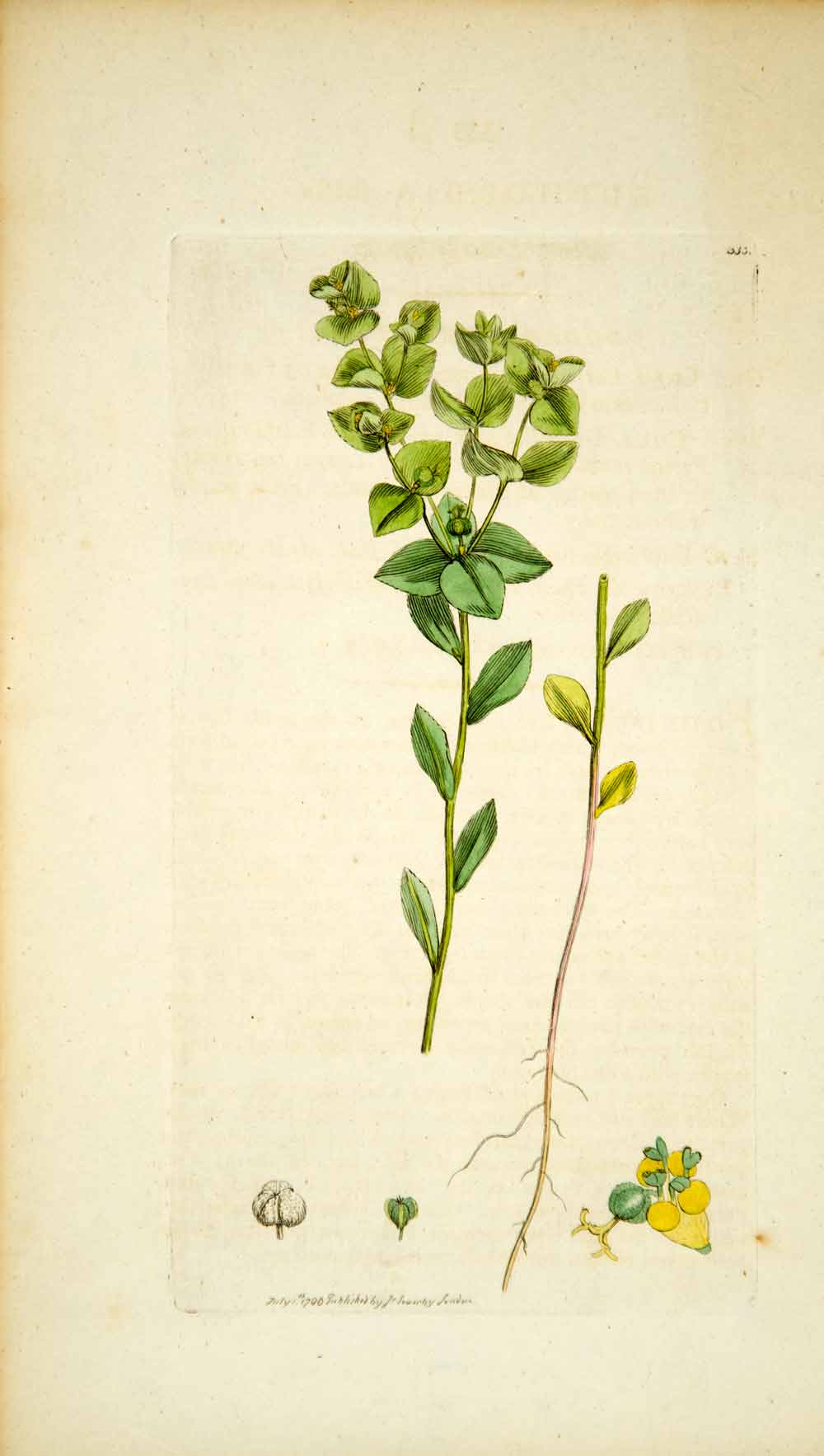 This is an original 1796 hand-colored copper engraving of the Euphorbia stricta, commonly known as upright warty spurge, that is found in England. A page of descriptive text accompanies this plate. Please see both images.