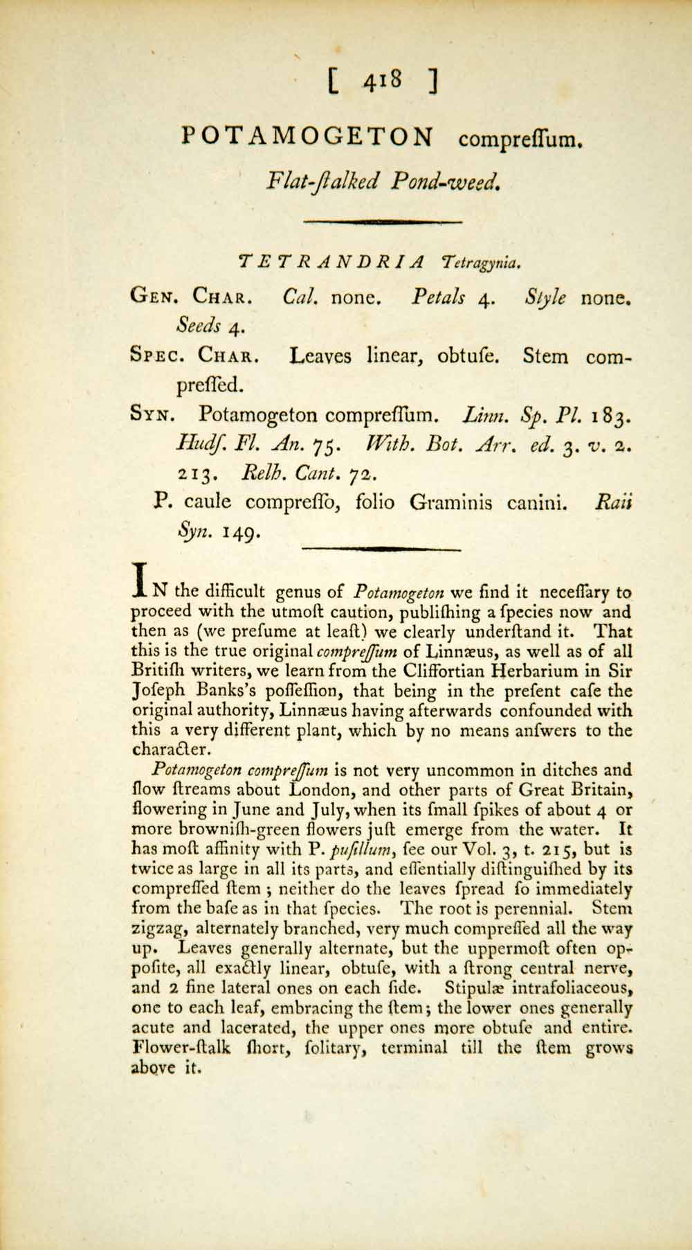 This is an original 1797 hand-tinted color copper engraving of the Potamogeton compressus, commonly known as flatstem pondweed or eel-grass pondweed, that is native to England and North America. A page of descriptive text accompanies this plate. Please see both images.
