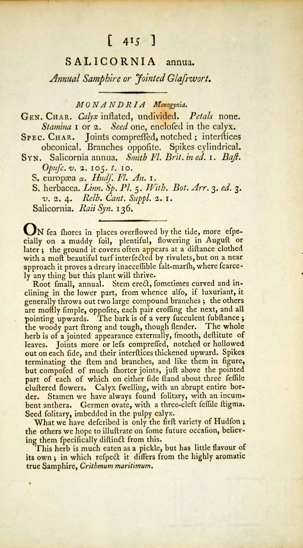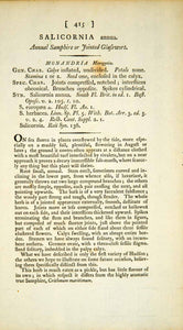 This is an original 1797 hand-tinted color copper engraving of the Salicornia europaea, commonly known as glasswort, annual samphire, or jointed glasswort, that is native to Europe and England. The plant is used as a source of soda ash, (i.e. sodium carbonate), to make soap and glass. A page of descriptive text accompanies this plate. Please see both images.
