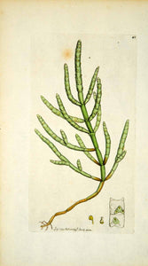 This is an original 1797 hand-tinted color copper engraving of the Salicornia europaea, commonly known as glasswort, annual samphire, or jointed glasswort, that is native to Europe and England. The plant is used as a source of soda ash, (i.e. sodium carbonate), to make soap and glass. A page of descriptive text accompanies this plate. Please see both images.
