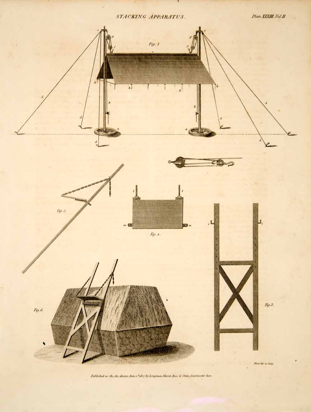 This is an original 1807 black and white copper engraving of a hay stacking apparatus (fig. 1), the frame of a moveable stacking stage (fig. 3), the stacking stage (fig. 4), the manner of attaching the chains to the stage or scaffold (fig. 5), and the stack with the moveable frame attached (fig. 6).