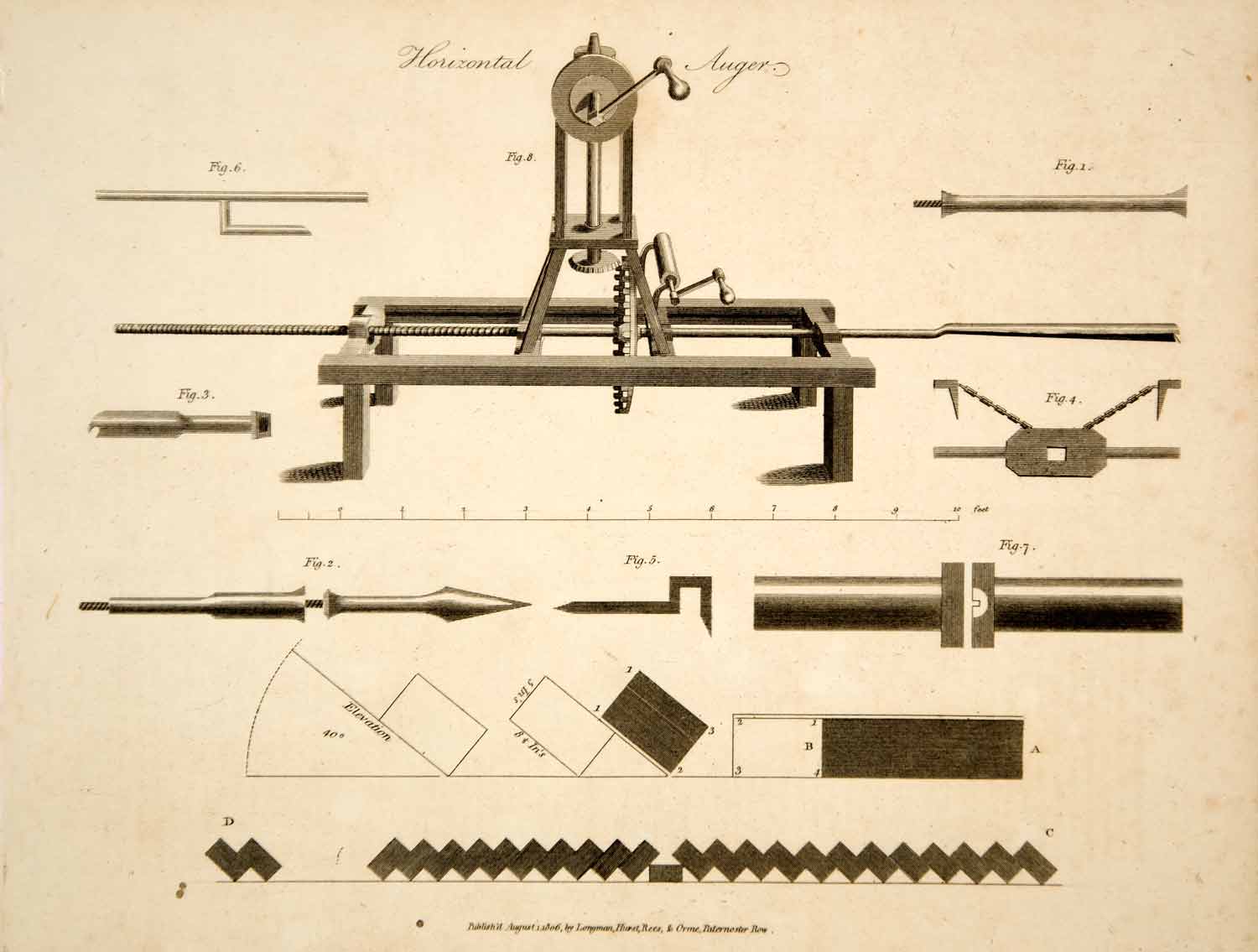 This is an original 1807 black and white copper engraving of an illustration by C. Blunt that details the parts and components of a Horizontal Auger boring machine that was invented by a Mr. Haford of Hathern in Leicestershire, England.